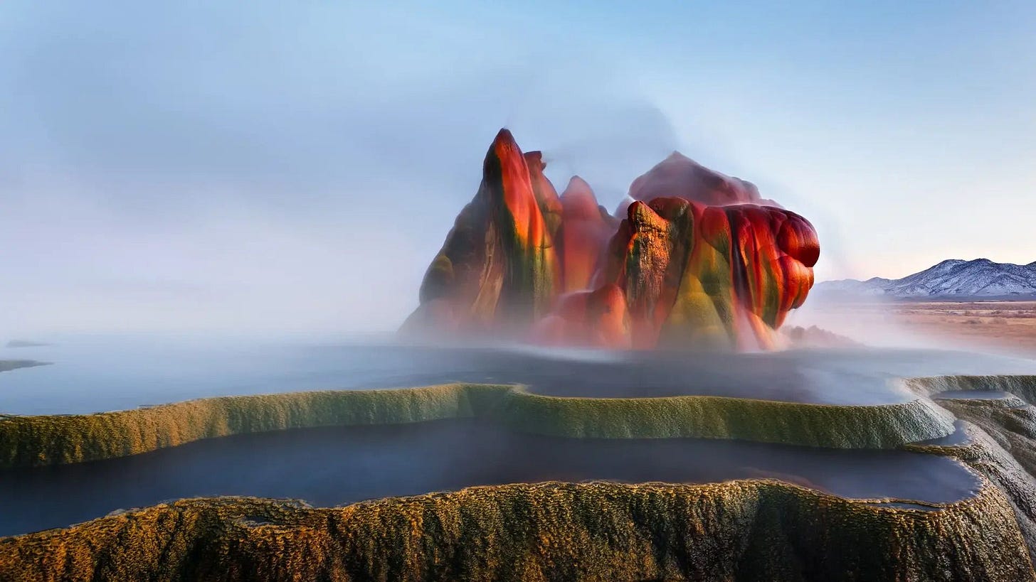 It formed by accident after drilling projects in the early and mid twentieth century reached a geothermal source of hot water. One of the wells was not sealed correctly and mineral-rich water began to rise through it. As the water cooled at the surface, it left behind layers of calcium carbonate and silica that built up into strange travertine formations. Over time, more minerals accumulated and more algae colonized the wet rock, shaping a colorful structure that continues to grow. Fly Geyser is both a natural geothermal fountain and a human mistake that turned into a surreal landscape shaped slowly by heat, minerals and biological life.